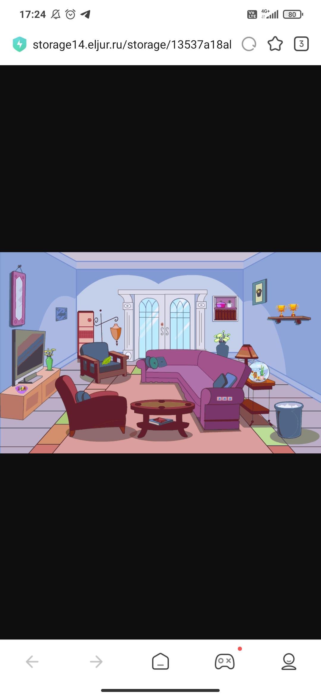 There are two chairs here. There is a sofa here. And TV. Next to which is a vase. Almost everything. Next to which is a vase. Almost everything here is on the carpet. There are paintings on the walls. And the table between the armchair and the sofa.