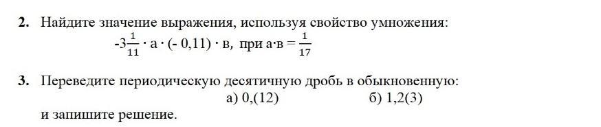 %1. Найдите значение выражения, используя свойство умножения: -3 (- 0,11) при ав = %1. Переведите периодическую десятичную дробь в обыкновенную: a) 0,(12)6) 1,2(3) и запишите решение.