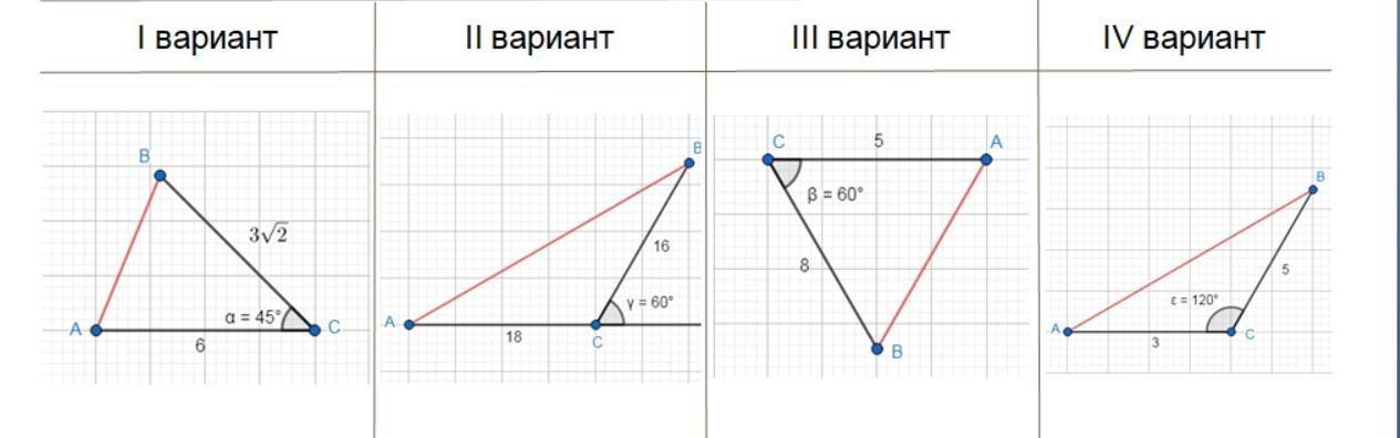 нужно найти АВ(( при АВС-треугольник;АС=18;СВ=16;угол ВСD=60 градусам (он вне треугольника) и остальные варианты тоже можно
