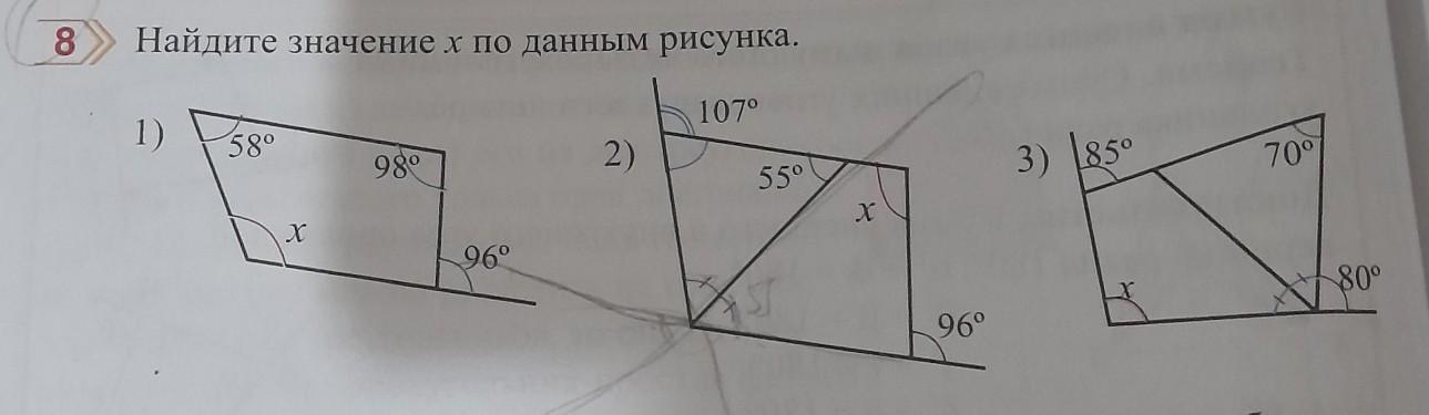 Найдите значение х по данным рисунка. 107⁰ 1) 58° X 98⁰ 96⁰ 2) 55° ST X 96⁰ 3) 85° 70° 80°