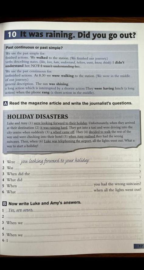 A Read the magazine article and write the journalist's questions. HOLIDAY DISASTERS Luke and Amy (1) were looking forward to their holiday. Unfortunately, when they arrived at their destination (2) it was raining hard. They got into a taxi and were driving into the city centre when suddenly (3) a wheel came off. They (4) decided to walk the rest of the way and were checking into their hotel (5) when Amy realised they had the wrong suitcases. Then, when (6) Luke was telephoning the airport, all the lights went out. What a way to start a holiday! 1 Were you looking forward to your holiday 2 Was 3 When did the 4 What did 5 When 6 What B Now write Luke and Amy's answers. 1 Yes, we were 2 3 When we 4 5 When we 61 suitcases? you had the wrong when all the lights went out? 17