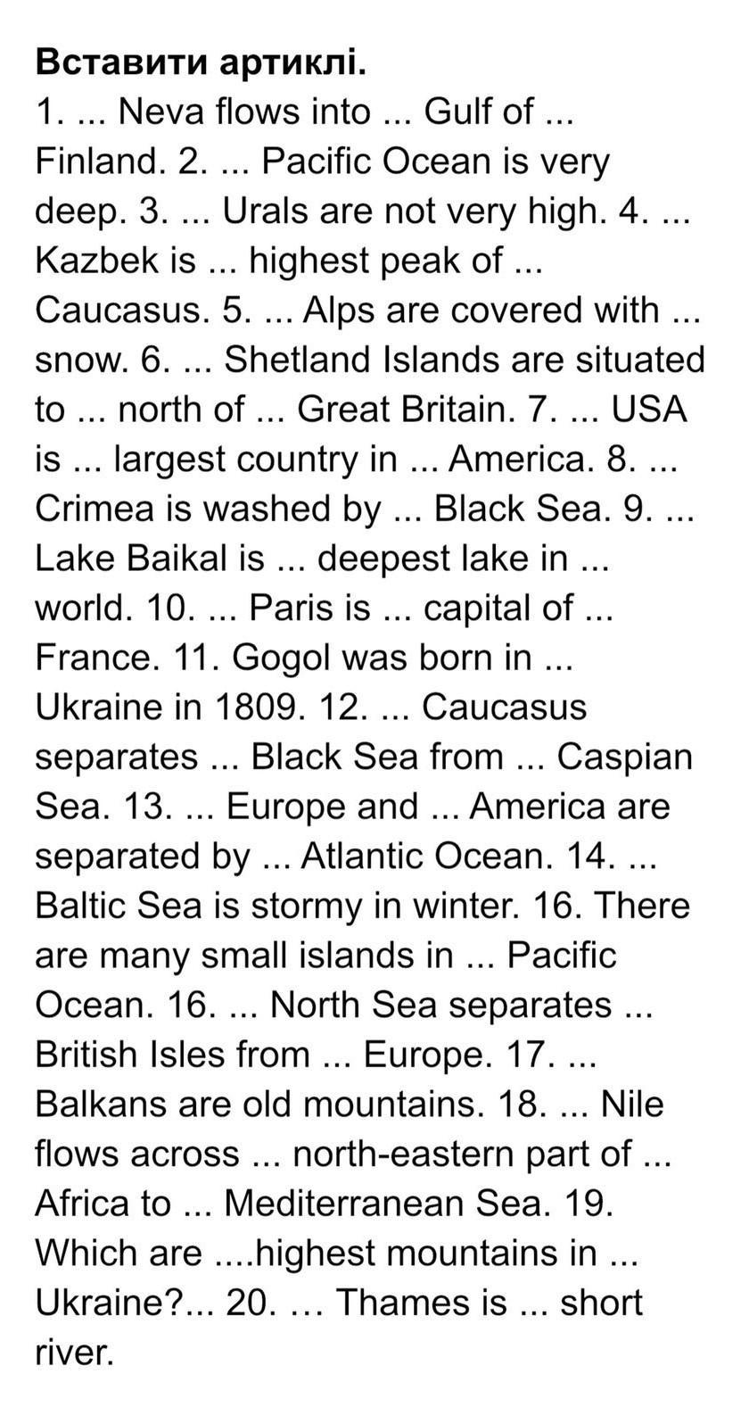 Вставити артиклі. 1. ... Neva flows into ... Gulf of ... Finland. 2. ... Pacific Ocean is very deep. 3. ... Urals are not very high. 4. ... Kazbek is... highest peak of ... Caucasus. 5. ... Alps are covered with ... snow. 6. ... Shetland Islands are situated to ... north of ... Great Britain. 7. ... USA is ... largest country in ... America. 8. ... Crimea is washed by ... Black Sea. 9. ... Lake Baikal is ... deepest lake in ... world. 10. ... Paris is ... capital of ... France. 11. Gogol was born in ... Ukraine in 1809. 12. ... Caucasus separates ... Black Sea from ... Caspian Sea. 13. ... Europe and ... America are separated by ... Atlantic Ocean. 14. ... Baltic Sea is stormy in winter. 16. There are many small islands in ... Pacific Ocean. 16. ... North Sea separates ... British Isles from ... Europe. 17. ... Balkans are old mountains. 18. ... Nile flows across ... north-eastern part of ... Africa to ... Mediterranean Sea. 19. Which are....highest mountains in ... Ukraine?... 20. ... Thames is ... short river.
