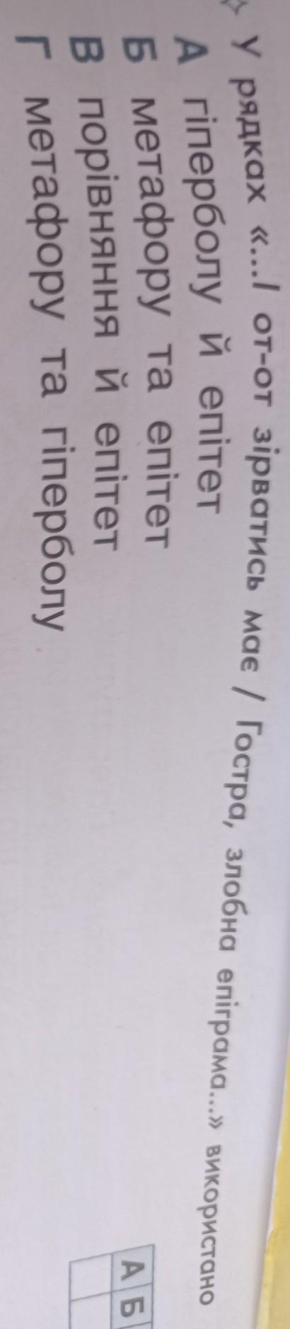 У рядках «.... от-от зірватись має / Гостра, злобна епіграма...» використано А гіперболу й епітет А Б В Б метафору та епітет в порівняння й епітет Г метафору та гіперболу Песі Українки Марований