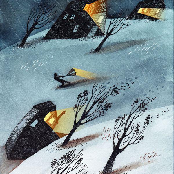It's raining outside and a strong wind is blowing. People are staying at home because of the bad weather outside the window. But one man is on the street and he is trying to save his umbrella from the strong wind. The trees are leaning along with the houses. Clouds are gathering in the sky. It seems the bad weather is not receding.