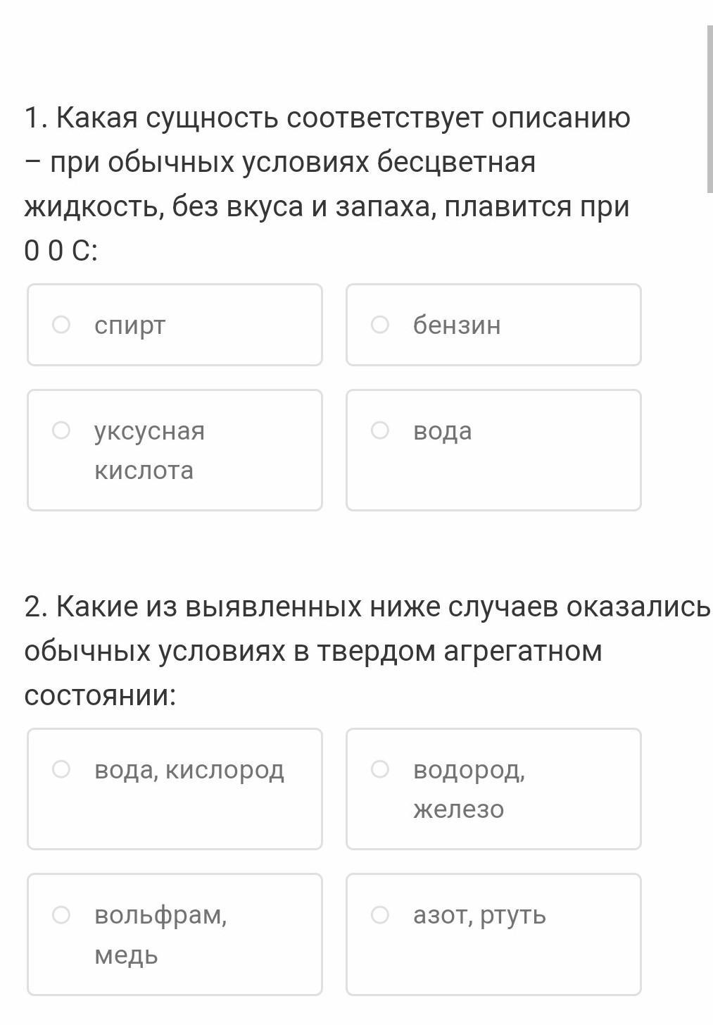 1. Какая сущность соответствует описанию – при обычных условиях бесцветная жидкость, без вкуса и запаха, плавится при 0 0 C: спирт уксусная кислота бензин вода