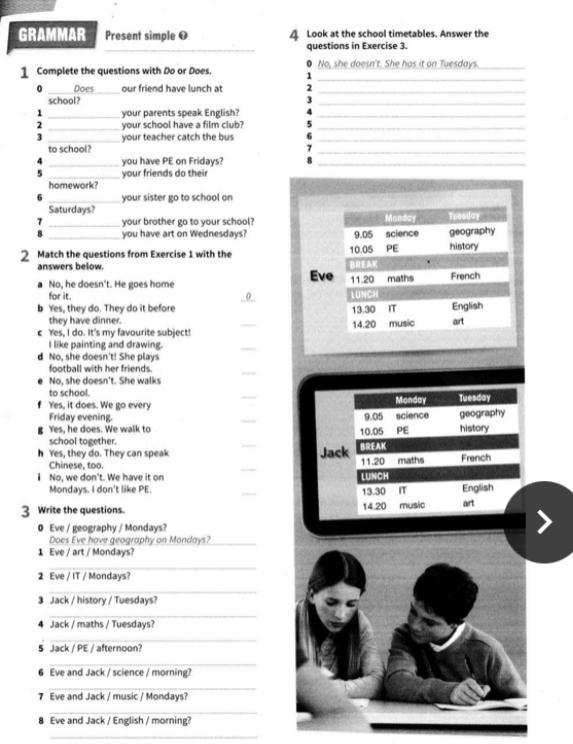 1. Complete the questions with Do or Does,2Match the questions from Exercise 1. With the answers below,3.Write the questions. Нужна помощь