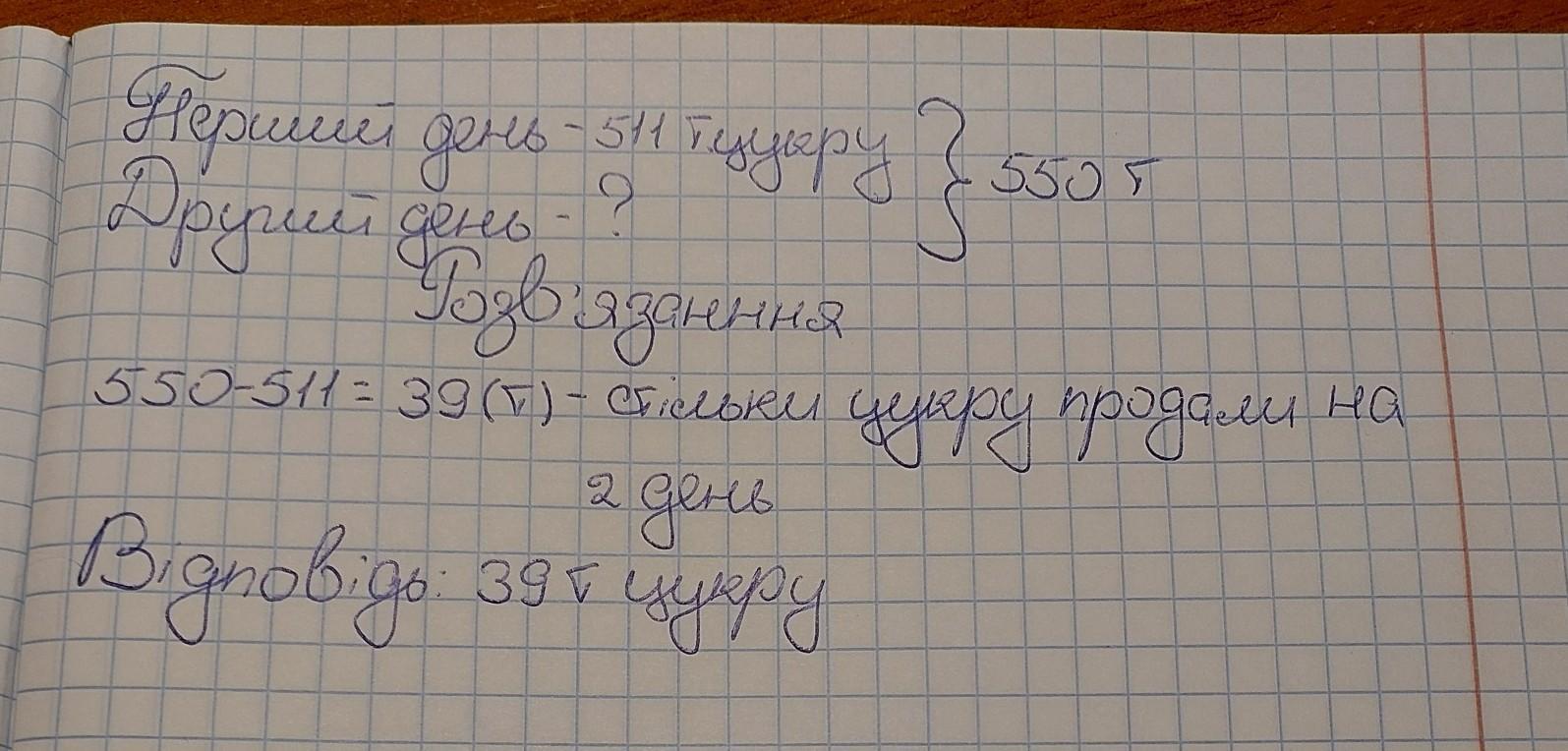 На складі було 550 т цукру. Першого дня продали 5