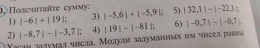 (580. Подсчитайте сумму: 1) |-6 | + | 19 |; 2) |-8,7|-|-3,7|; 3) 1-5,61 +1-5,91; 4) |19|-|-81 |; 5) 132,11-1-22,1 6) 1-0,71-1-0,71. запуманных им чисел равны пожалуйста скажите мне пожалуйста я сразу скажу я дам 100 баллов