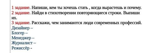 |1 задание. Напиши, кем ты хочешь стать, когда вырастешь и почему. 2 задание. Найди в стихотворении повторяющиеся строки. Выпиши их. З задание. Расскажи, чем занимаются люди современных профессий. TT- Ч