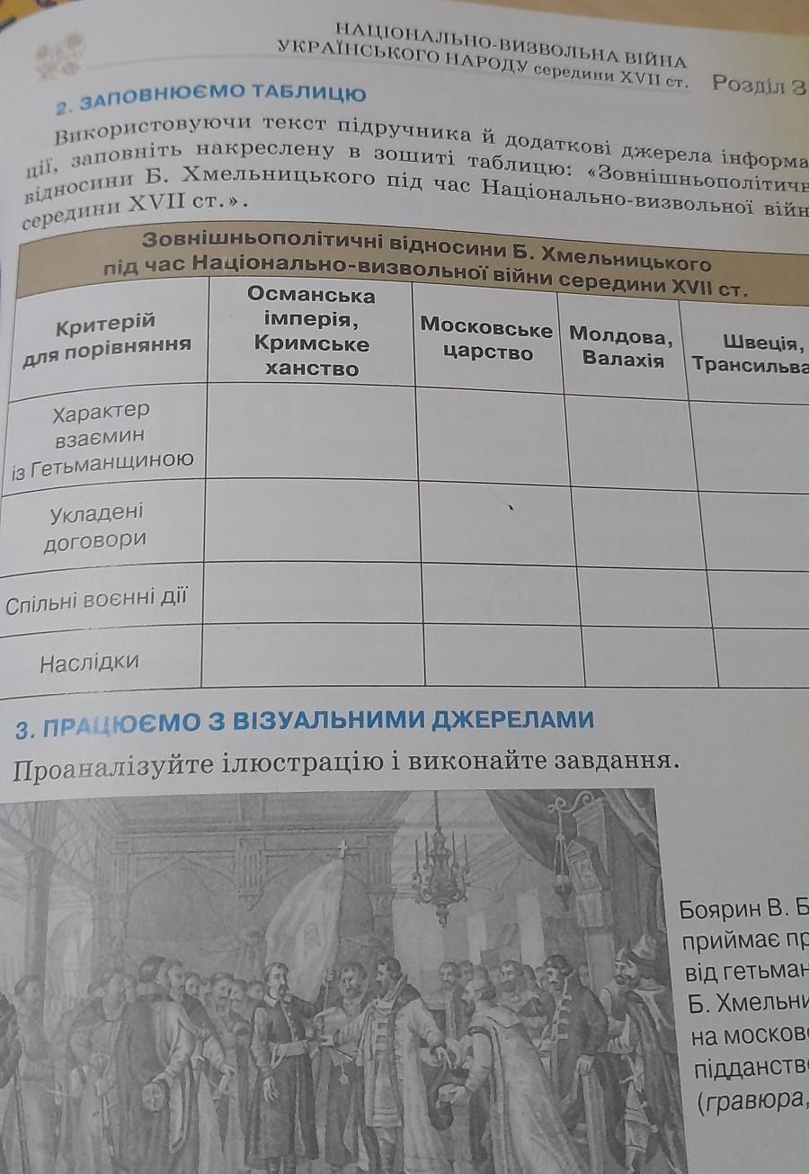 2. ЗАПОВНЮЄМО ТАБЛИЦЮ Використовуючи текст підручника й додаткові джерела інформа- відносини Б. Хмельницького під час Національно-визвольної війни ції, заповніть накреслену в зошиті таблицю: «Зовнішньополітичні Зовнішньополітичні відносини Б. Хмельницького під час Національно-визвольноï вiйни середини XVII ст. середини XVII ст.». Османська імперія, Кримське ханствО Критерій для порівняння Характер взаємин iз Гетьманщиною Укладені договори Спільні воєнні дії У середини XVII ст. Розділ 3 Наслідки Московське Молдова, Швеція, царство хосить Валахія Трансильванія 103 РIЗУАЛЬНИМИ ДЖЕРЕЛАМИ