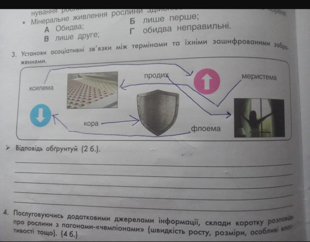 3. Установи асоціативні зв'язки між термінами та ïхніми зашифрованими зобра женнями. ксилема кора > Відповідь обґрунтуй (2 б.). ПРОДИХ флоема меристема