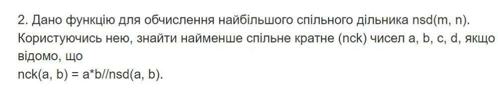 Якщо ви вже маєте функцію для обчислення найбільшого спільного дільника (nsd), то можете використати її, щоб знайти найменше спільне кратне (nck) двох чисел, використовуючи наступну формулу: