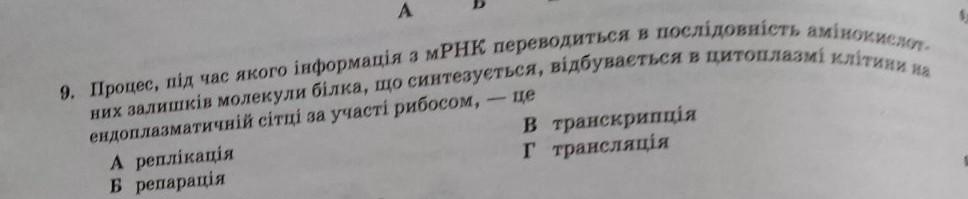 СРОЧНООО ПОЖАЛУЙСТАААААА 9. Процес, пiд час якого iнформацiя з мРНК переводиться в послідовність амінокислотних залишків молекули білка, що синтезуеться, відбувається в цитоплазмі клітини на ендоплазматичнiй сітцi за участі рибосом, - це