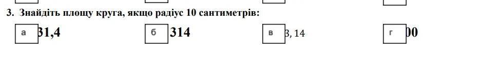 3. Знайдіть площу круга, якщо радіус 10 сантиметрів