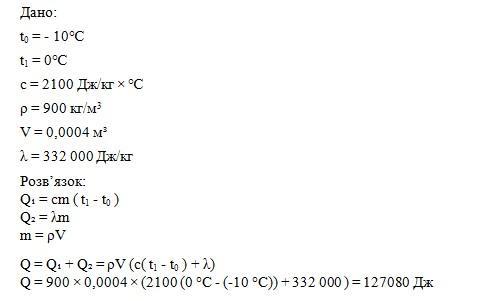 Q = 900 × 0,0004 × (2100 (0 °C - (-10 °C)) + 332 000 ) = 127080 Дж