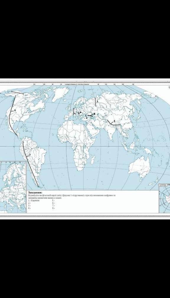 Завдання 2. Позначте на контурній карті гори та вулкани: Гори: Карпати, Кримські, Альпи, Уральські, Кордильєри, Кавказ, Гімалаї з вершиною Джомолунгма Анди. Вулкани: Ключевська Сопка, Кракатау, Фудзiяма, Кенія, Ельбрус, Льюльяйльяко, Кіліманджаро, Етна, Гекла..