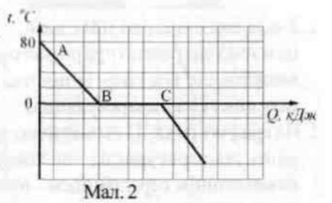 На графіку (мал. 2) схематично зображено зміну температури 250 г води під час теплообміну з навколи- шнім середовищем. Яким процесам на графіку відповідають ділянки AB i BC? Чому дорівнює зміна внутрішньої енергії води на цих ділянках?