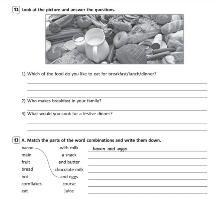 1) For breakfast I like to eat pancakes and drink some milk with them.