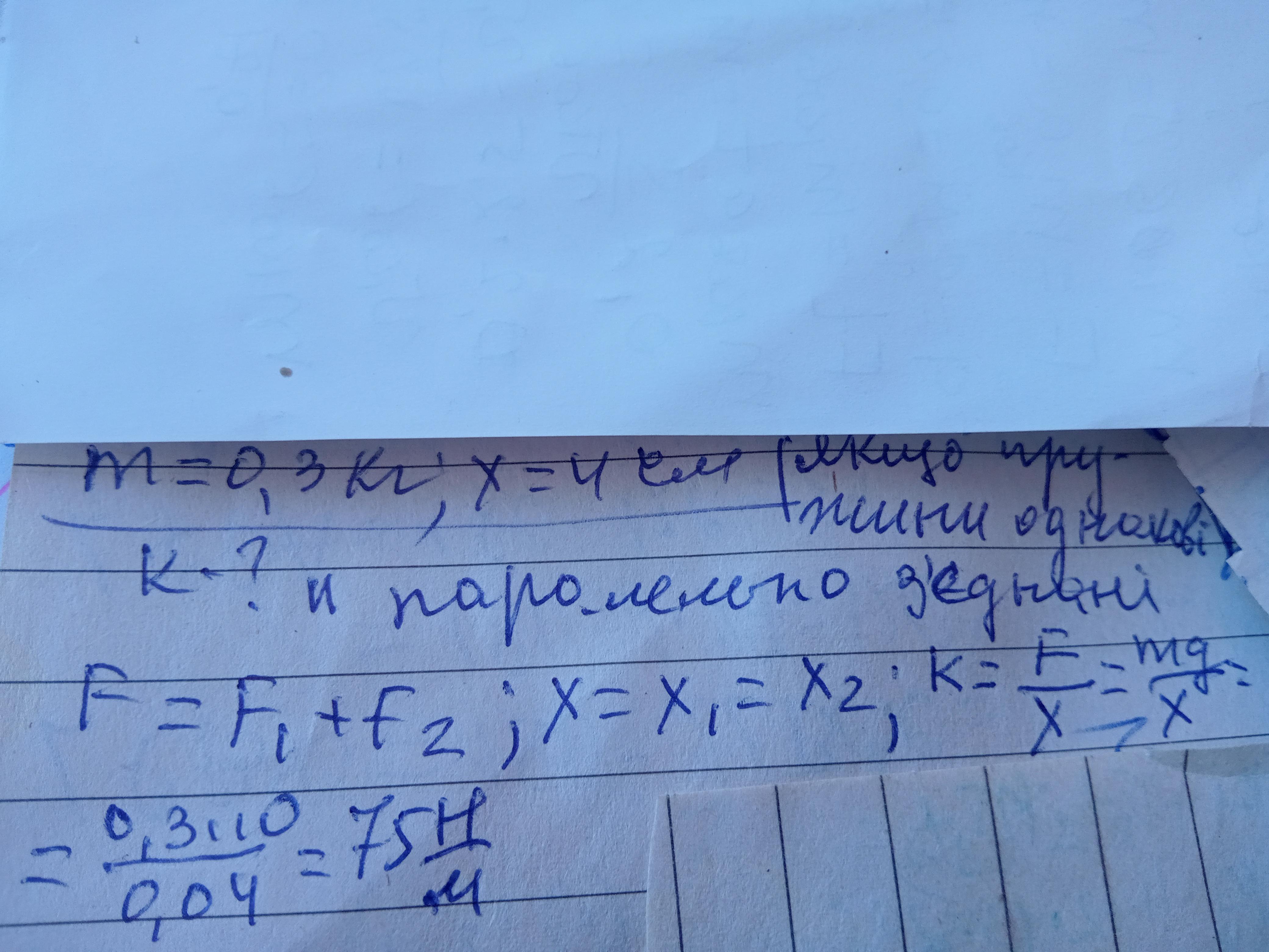 Тіло масою М=300 підвішене на 2 пружинах жорсткістю К-? та видовженням Х=4. Знайти невідому величину. ОЧЕНЬ СРОЧНО!!
