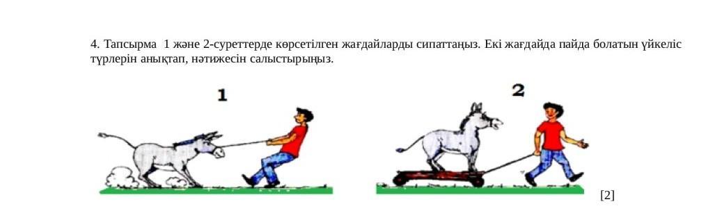 4. Тапсырма 1 және 2-суреттерде көрсетілген жағдайларды сипаттаңыз. Екi жағдайда пайда болатын үйкеліс түрлерін анықтап, нәтижесін салыстырыңыз. для 1