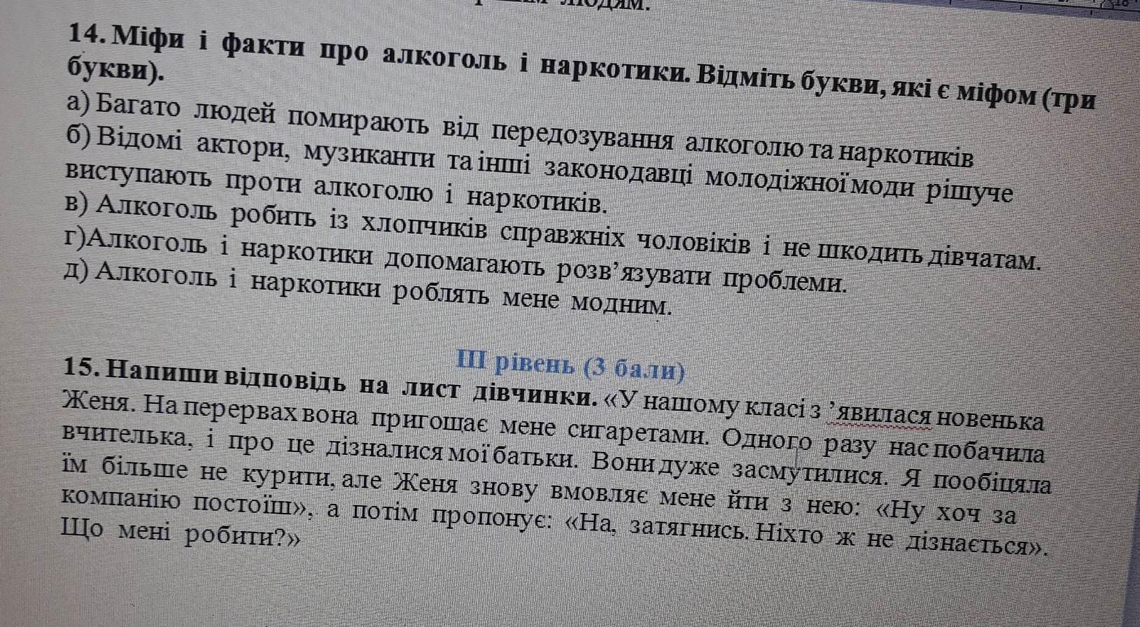 15. Тобі не варто слухати Женю. Подумай, навіть якщо твої батьки нічого не дізнаються, яку користь тобі принесе куріння цигарок? Куріння приносить тільки шкоду, навіть якщо ти будеш не сама курити, а просто стояти поряд з тими, хто курить. Вмій постояти за себе, і відмовляти всім, хто пропонує тобі займатися чимось поганим!