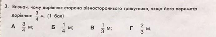 Визнач, чому дорівнює сторона рівностороннього трикутника, якщо його периметр дорівнює 3/4 м