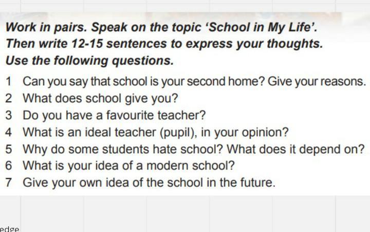 1. Unfortunately, no, my home is my home and school is a school. I get knowledge at school and I rest at home. 2. The school gives me communication with other people, experience and knowledge. 3. I love and respect all teachers. For me, all teachers are smart people. 4. For me, the ideal teacher is the person with the greatest life experience. 5. I think that first of all it depends on the teachers. Maybe it's because of family problems. 6. For me, the ideal school is when there is no bowling alley. I would also like our schools to look like American ones. 7. A scale where each student has his own room. I also want everyone to have computers at the school of the future.