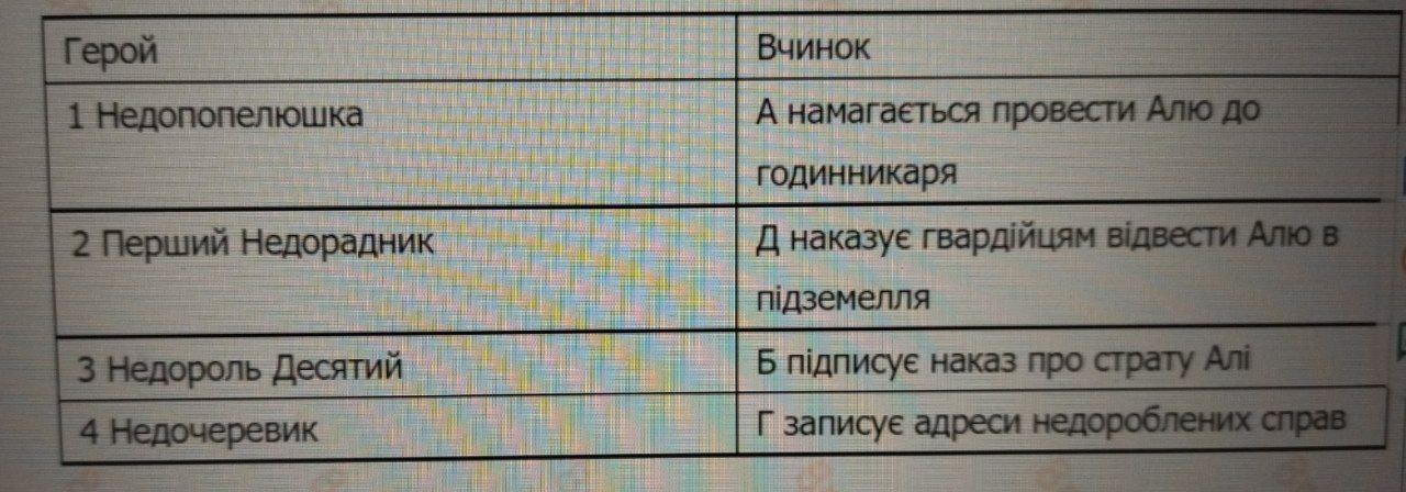 Установіть відповідність: Недопопелюшка - Перший Недорадник - Недороль Десятий - Недочеревик наказує гвардійцям відвести Алю в підземелля записує адреси недороблених справ намагається провести Алю до годинникаря підписує наказ про страту Алі