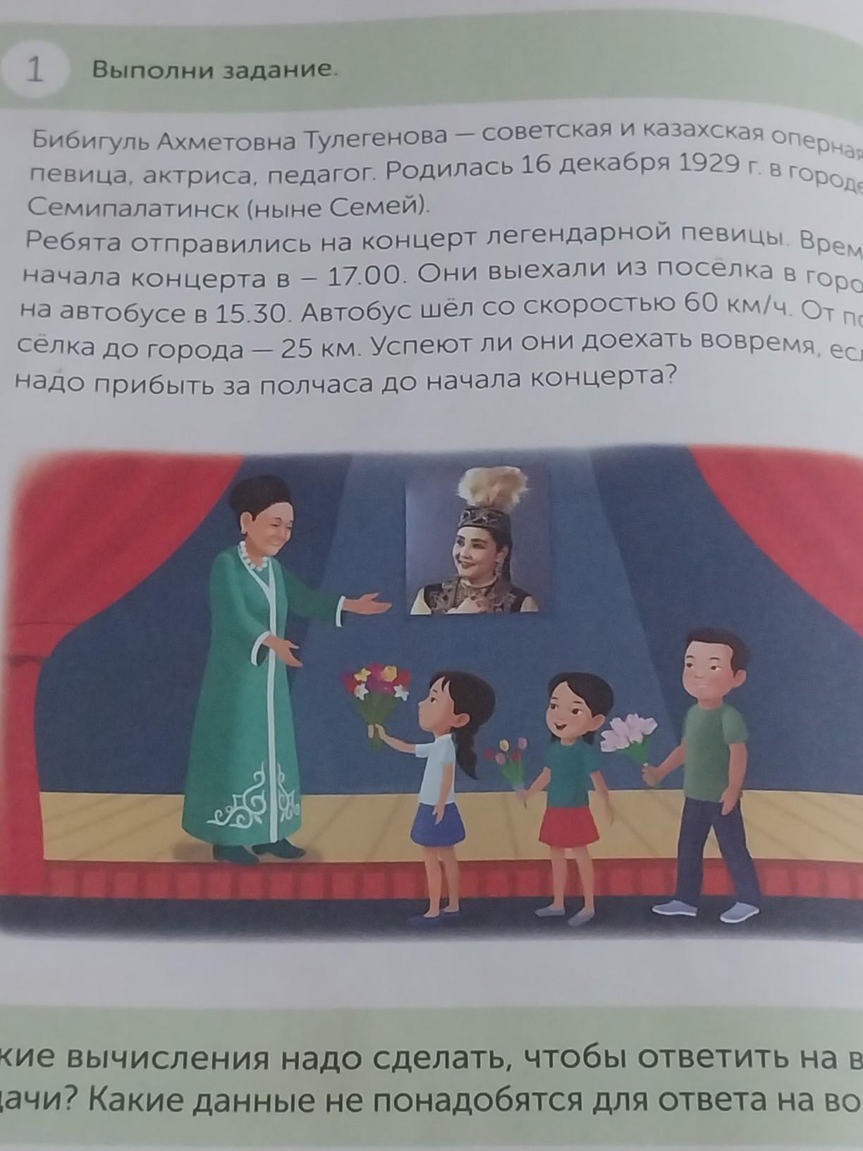 Ты научишьс! на встречное движение с помощью уравнения. Выполни задание. Бибигуль Ахметовна Тулегенова-советская и казахская оперная певица, актриса, педагог Родилась 16 декабря 1929 г. в городе Семипалатинск (ныне Семей). Ребята отправились на концерт легендарной певицы. Время начала концерта в - 17.00. Они выехали из поселка в город на автобусе в 15.30. Автобус шел со скоростью 60 км/ч. От по- селка до города - 25 км. Успеют ли они доехать вовремя, если надо прибыть за полчаса до начала концерта? а