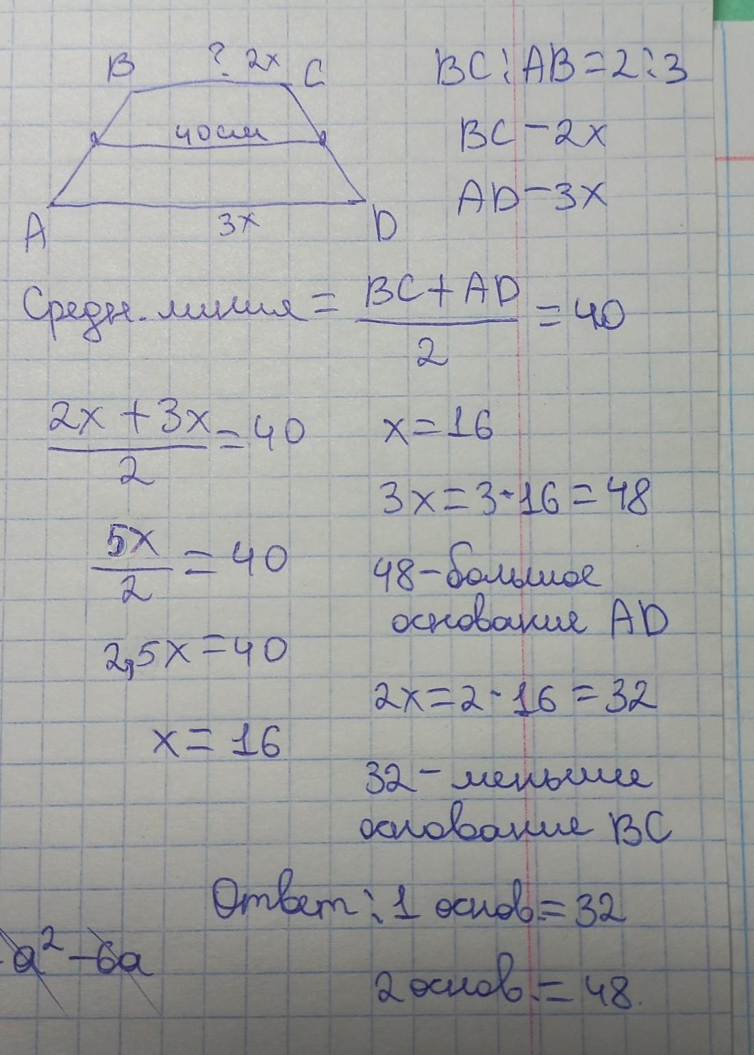 середня лінія трапеції дорівнює 40 см, а її основи відносяться як 2:3. знайдіть довжину меншої основи