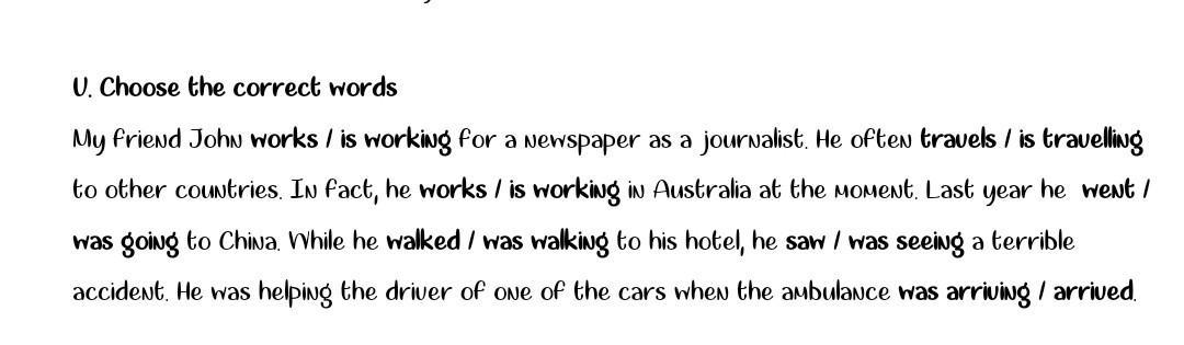 works, travels, is working, went, was walking, saw, arrived.
