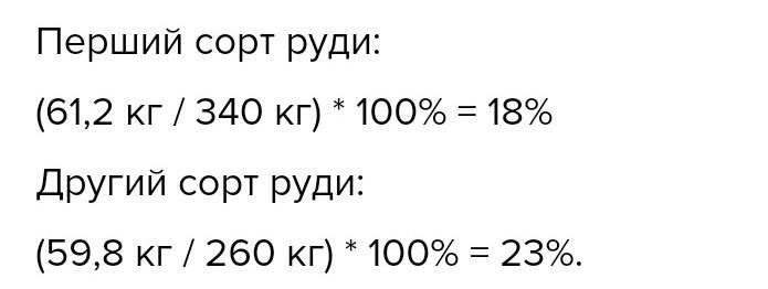 Видомо що 340 кг руди одного сорту мистять 61,2 кг зализа а 260 кг руди иншого сорту 59,8 кг зализа. В який руди , перший чи другий,вищий видцотковый вмист зализа