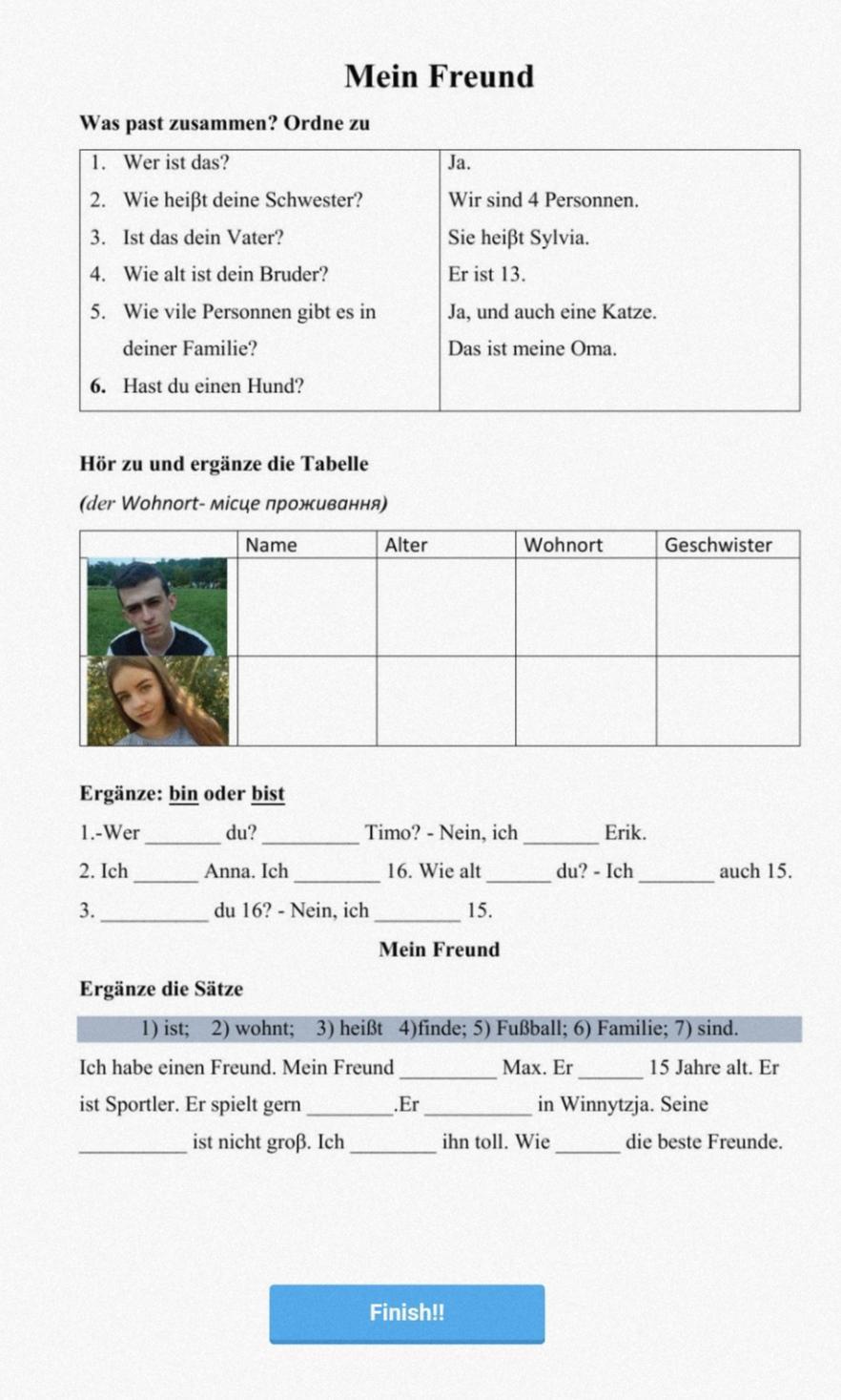 Привіт 1) 1-3, 2-5, 3-2, 4-4, 5-6, 6-1. 2) bist, bist, bin; bin, bin, bist, bin; bist, bin. 4) 1 heißt, 2 ist, 3 Fußball, 4 wohnt, 5 Familie, 6 finde, 7 sind.