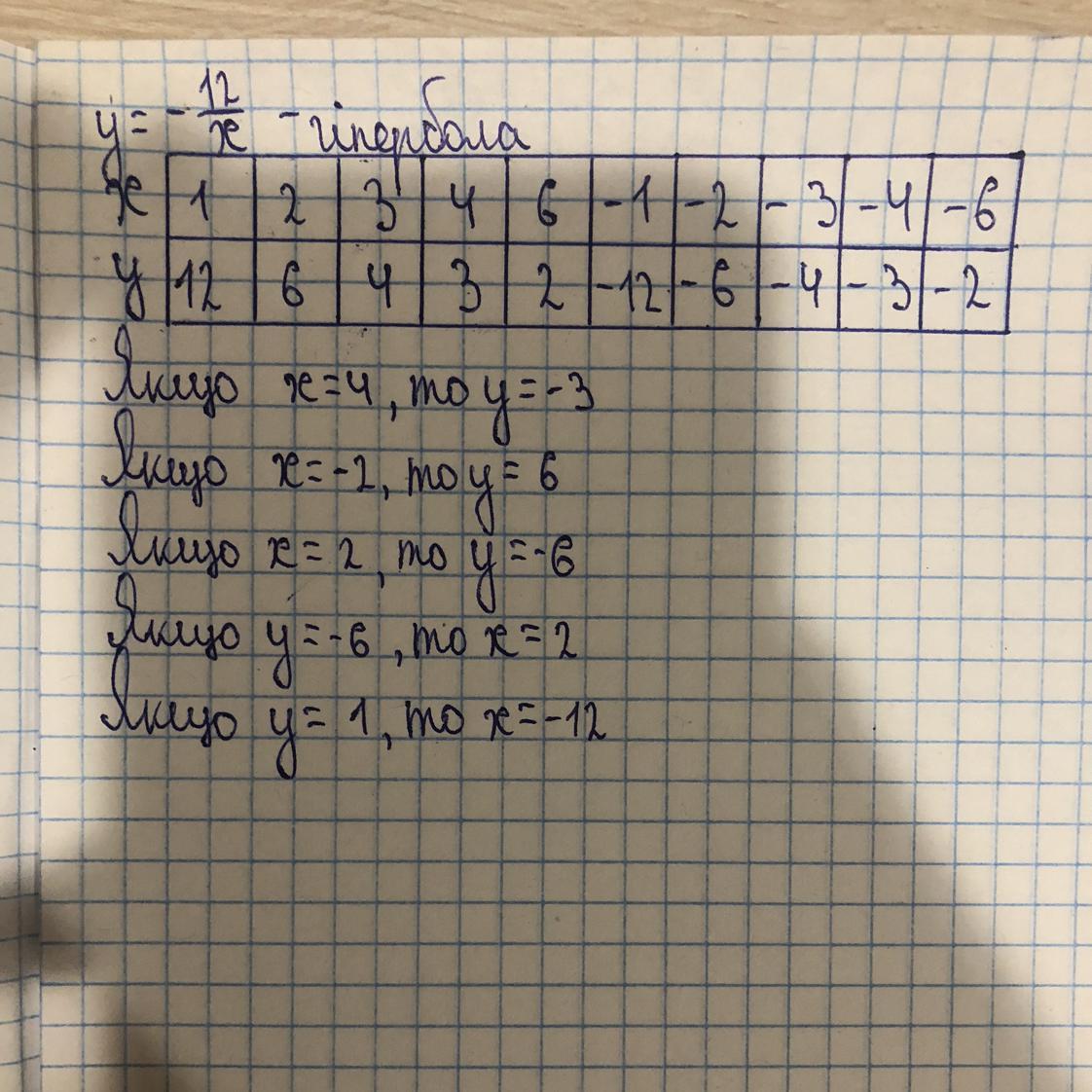 Побудуйте графік функції у = -12/хграфіком знайдіть: 1) значення функції, якщо х = 4; -2 2) значения аргументу, при яких функція дорівню -6;1