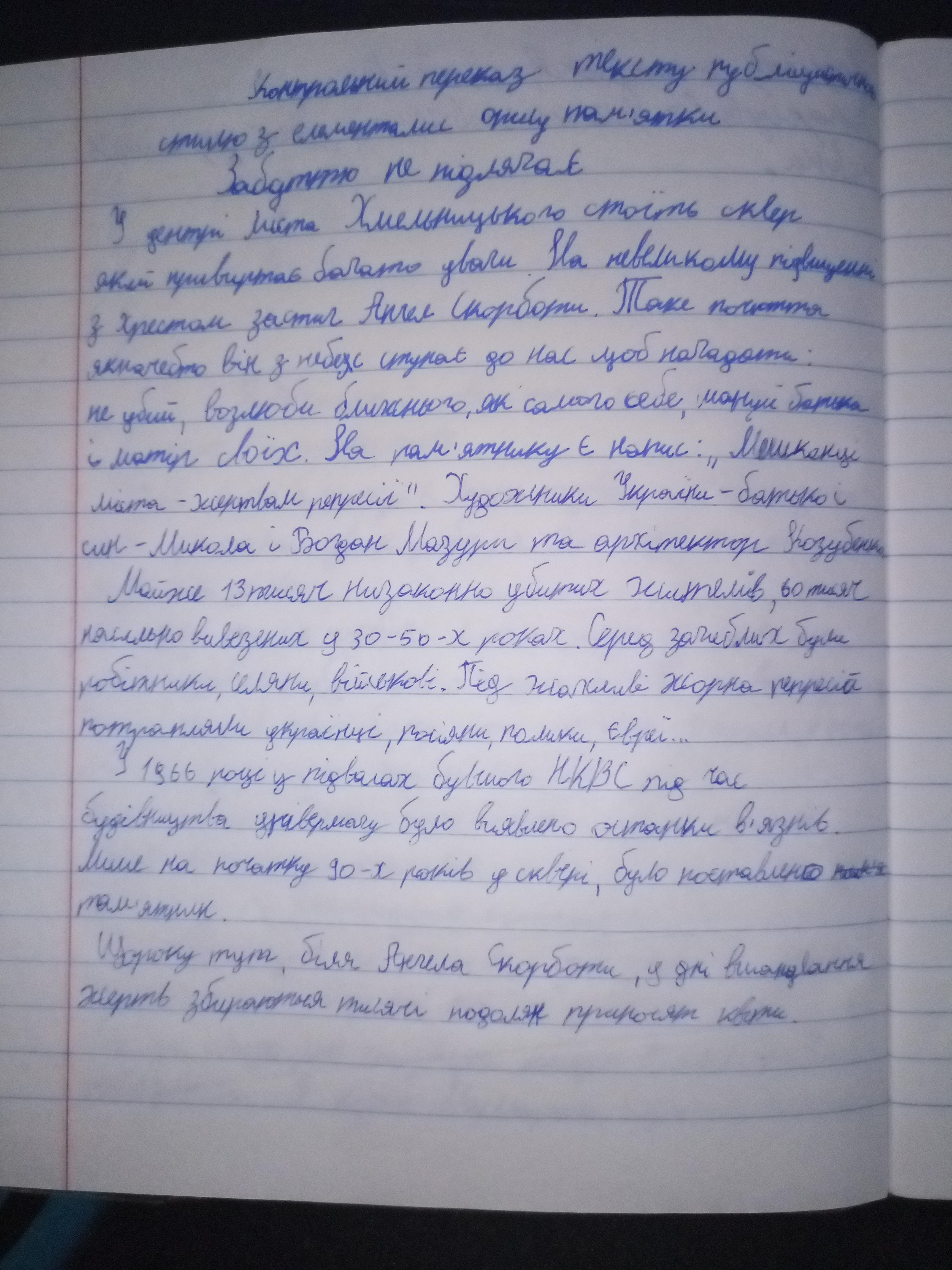 Контрольний докладний письмовий переказ розповідного тексту з елементами опису пам'яток історії й культури в публіцистичному стилі за складним планом із використанням прикладок.