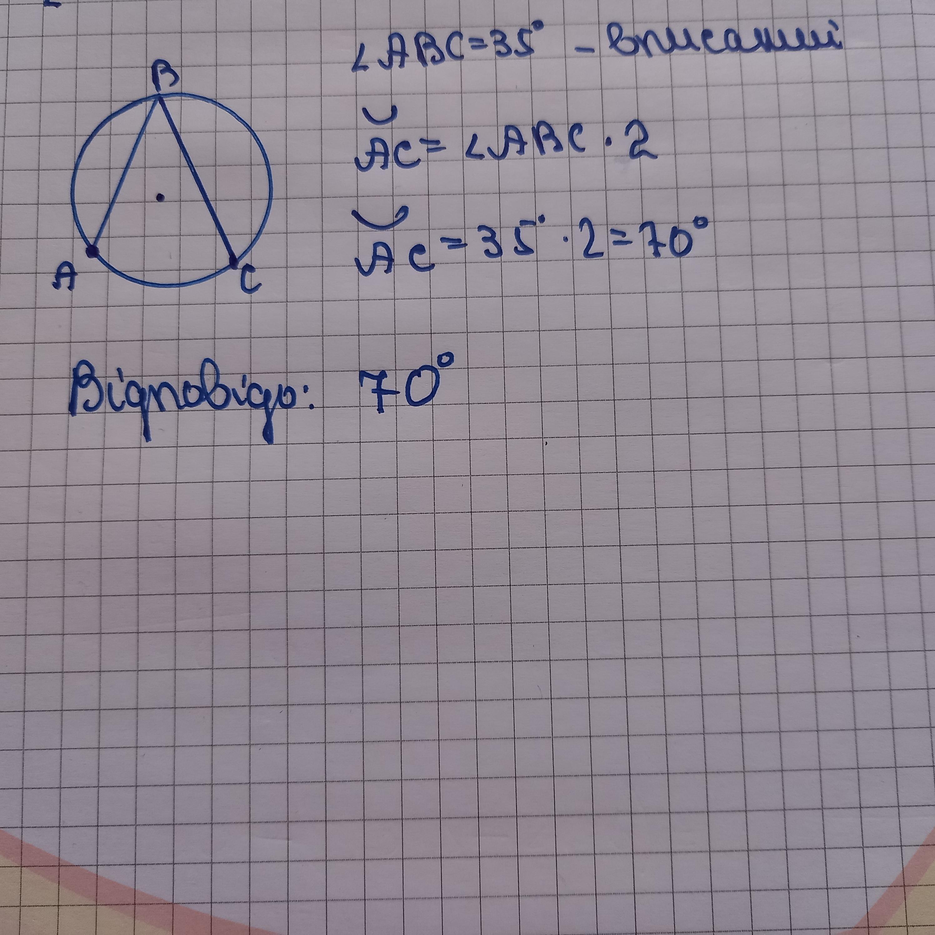 вписаний кут, якій спираються на дугу АС = 35 градусів, знайти градусник міру дуги