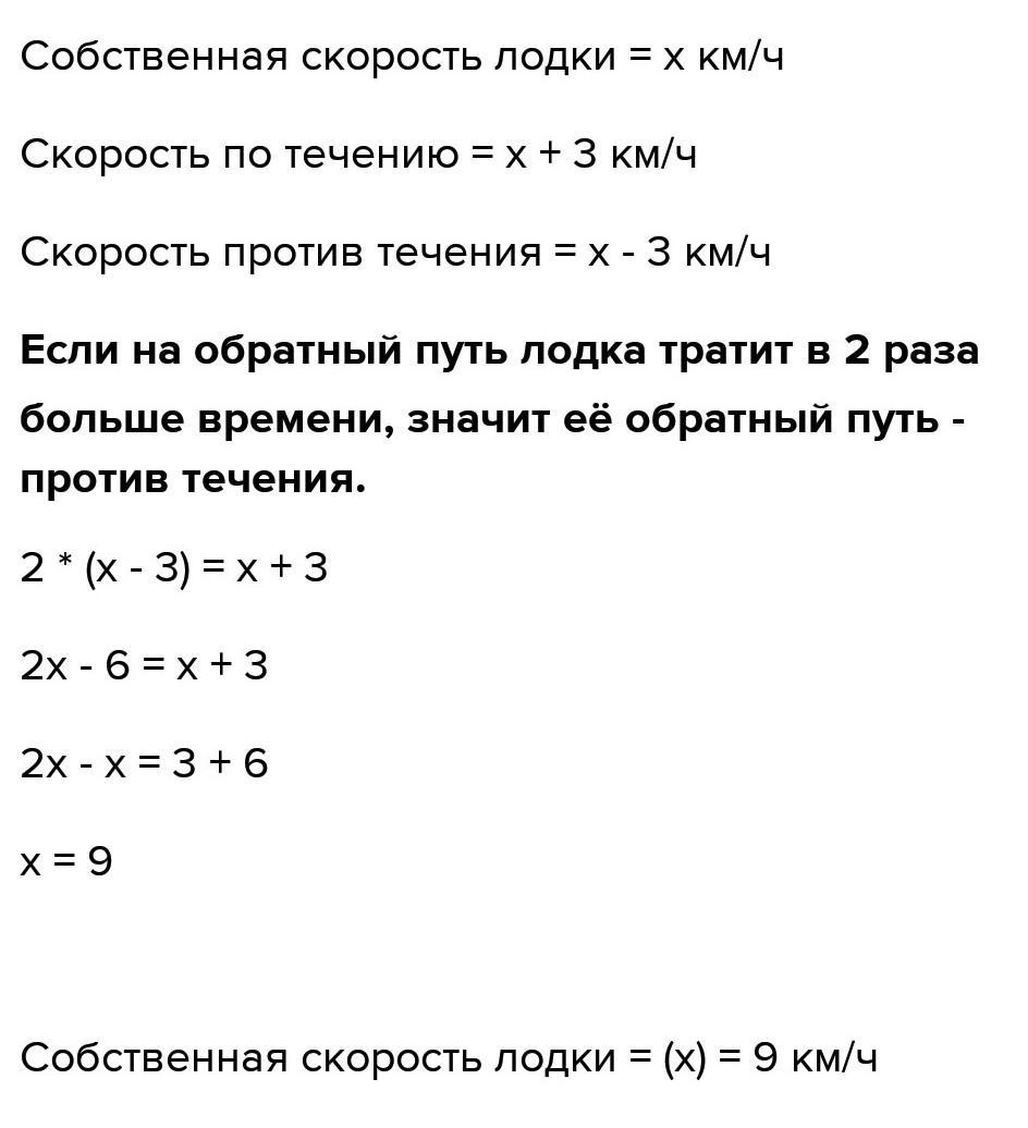 лодка тратит на возвращение в 2 раза дольше чем за пункта А до Б найдите скорость Х Лодки если скорость течение 3км\ч