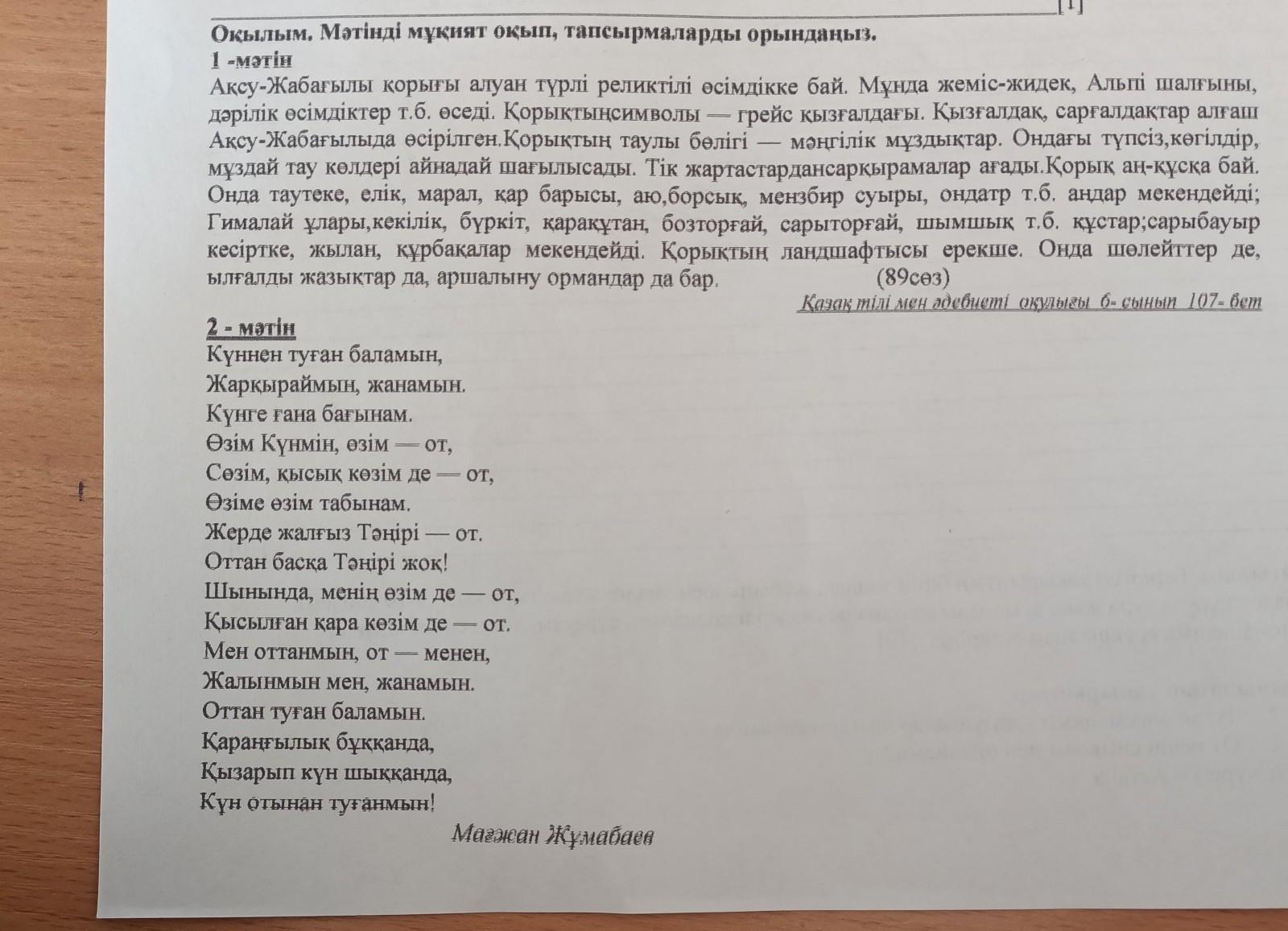 1.Берілген мәтіндердің тақырыбын анықтаңыз. 2. Мәтіндердің түрі мен стилін салыстырыңыз. [2] 1 - мәтін 1 Түрі Стилі 3. Бірінші мәтіннен негізгі және жанама ақпаратты аныктап, (V) белгісімен белгілеңіз. [1] №₂ Ақпараттар негiзгi жанама Қорықтынсимволы Қорық аң-құсқа бай - - грейс кызгалдағы 2 - мәтiн [1] Жазылым. Берілген екі такырыптардынбiрiн танлоп 2 3 Ақсу-Жабағылы қорығы алуан түрлі реликтілі өсімдікке бай 4. Берілген сөздерді қолданып, сұраққа жауап беріңіз. Қорық, көрікті жерлер, парыз, шөлейт, ну орман Біздің облысымызда ерекше қорғауға арналған жерлер бар ма? Сен онда болдын ба? [1]