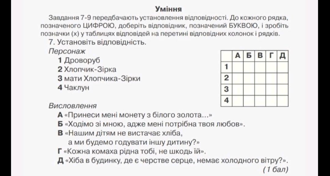 Объяснение: Серед наведених слів немає тих, які належать Хлопчику-Зірці. Варіант В - слова дружини дроворуба, варіант Г - слова старого священника.