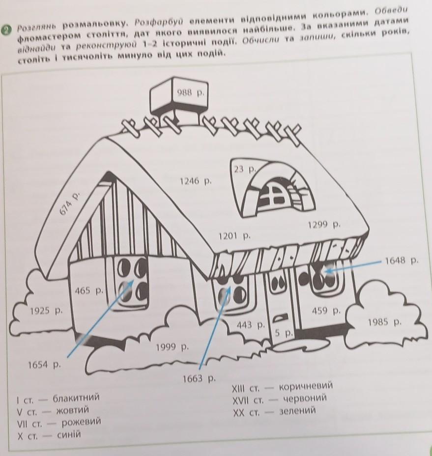 Розглянь розмальовку. Розфарбуй елементи відповідними кольорами. Обведи фломастером століття, дат якого виявилося найбільше. За вказаними датами віднайди та реконструюй 1-2 історичні події. Обчисли та запиши, скільки років, століть і тисячоліть минуло від цих подій. 1925 р. 1654 р. ст. 674 р. 465 р. ст.-блакитний жовтий ст. - - рожевий CT. синій вер IPE 1999 р. 988 р. 1246 р. 1663 р. ккккк 23 р. 1201 р. 443 р. XIII ст. XVII CT. ХХ ст. 100 p. 1299 р. ПЕ 459 р. коричневий червоний зелений 1648 р. 1985 р.