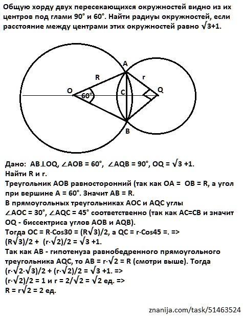 Спільну хорду двох кіл, що перетинаються, видно з їхніх центрів під кутами 90 і 60°. Знайти радіуси кіл, якщо відстань між їх центрами дорівнює √3+1
