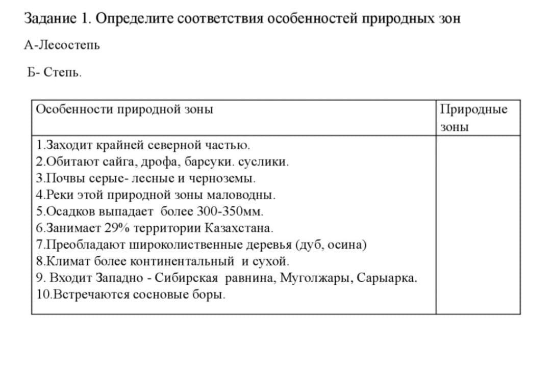 Задание 1. Определите соответствия особенностей природных зон