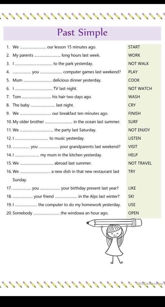 81 D 1. We. 2. My parents. 3. I... 4. 5. Mum. delicious dinner yesterday. 6. ................... .TV last night. 7. Tom his hair two days ago. 8. The baby. last night. 9. We .....................our breakfast ten minutes ago. *********** 10. My older brother. 11. We...................... 12.1. 13.. 14.1 15. We. 16. We Sunday. .you Past Simple 17.. 18...... our lesson 15 minutes ago. .long hours last week. to the park yesterday. computer games last weekend? .............in the ocean last summer. the party last Saturday. to music yesterday. your grandparents last weekend? .you ......my mum in the kitchen yesterday. abroad last summer. .............a new dish in that new restaurant last .you your birthday present last year? your friend......................the Alpss last winter? 19.......................the computer to do my homework yesterday. 20. Somebody. the windowa an hour ago. START WORK NOT WALK PLAY COOK NOT WATCH WASH CRY FINISH SURF NOT ENJOY LISTEN VISIT HELP NOT TRAVEL TRY LIKE SKI USE OPEN 81 3 10 11 помогите пожалуйста!!!