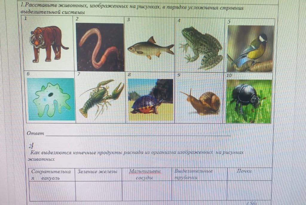 2 Как выделяются конечные продукты распада из организма изображенных на рисунках животных Сократительна я вакуоль Зеленые железы Мальnuzuевы сосуды Выделительные прубочки Почки
