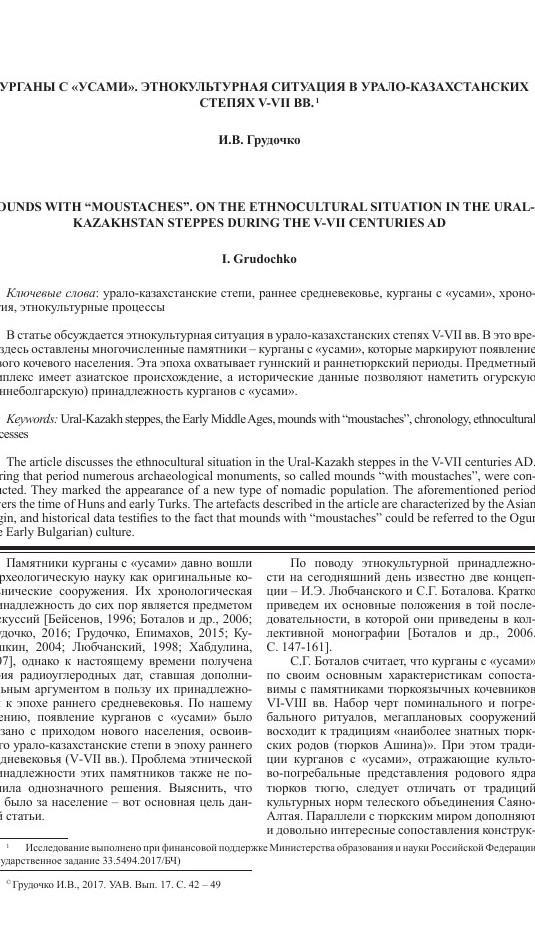 В статье обсуждается этнокультурная ситуация в урало-казахстанских степях V-VII вв. В это время здесь оставлены многочисленные памятники курганы с «усами», которые маркируют появление нового кочевого населения. Эта эпоха охватывает гуннский и раннетюркский периоды. Предметный комплекс имеет азиатское происхождение, а исторические данные позволяют наметить огурскую (раннеболгарскую) принадлежность курганов с «усами».