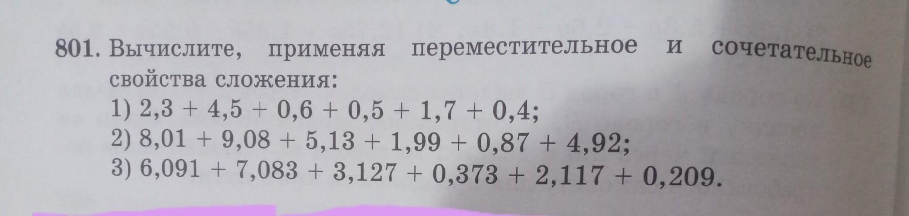 801. Вычислите, применяя переместительное свойства сложения: 1) 2,3 + 4,5 + 0,6 + 0,5 + 1,7 + 0,4; 2) 8,01 +9,08 +5,13 + 1,99 + 0,87 +4,92; 3) 6,091 +7,083 +3,127 +0,373 + 2,117 + 0,209. и сочетательное