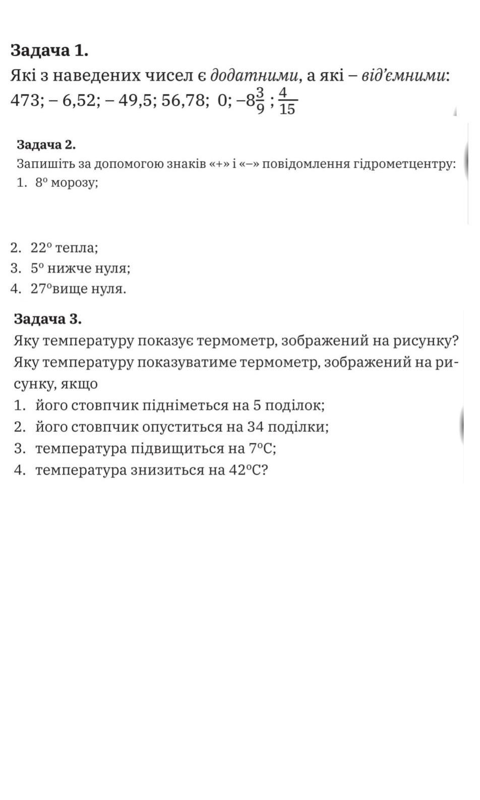 Задача 1. Які з наведених чисел є додатними, а які – від’ємними: 3 4 473; 6,52; 49,5; 56,78; 0; - . 2. 22° тепла; 3. 5° нижче нуля; 4. 27°вище нуля. 9' 15 Задача 2. Запишіть за допомогою знаків «+» і «-» повідомлення гідрометцентру: 1. 8° морозу; Задача 3. Яку температуру показує термометр, зображений на рисунку? Яку температуру показуватиме термометр, зображений на ри- сунку, якщо 1. його стовпчик підніметься на 5 поділок; 2. його стовпчик опуститься на 34 поділки; 3. температура підвищиться на 7°С; 4. температура знизиться на 42°С?