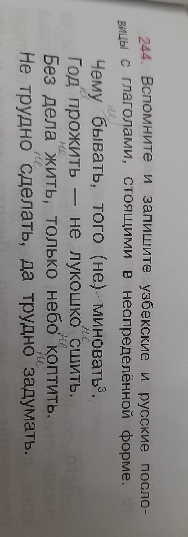 244. Вспомните и запишите узбекские и русские посло- вицы с глаголами, стоящими в неопределённой форме. Чему бывать, того (не) миновать3. не не не не лукошко сшить. не Год прожить не Без дела жить, только небо коптить. не не Не трудно сделать, да трудно задумать.