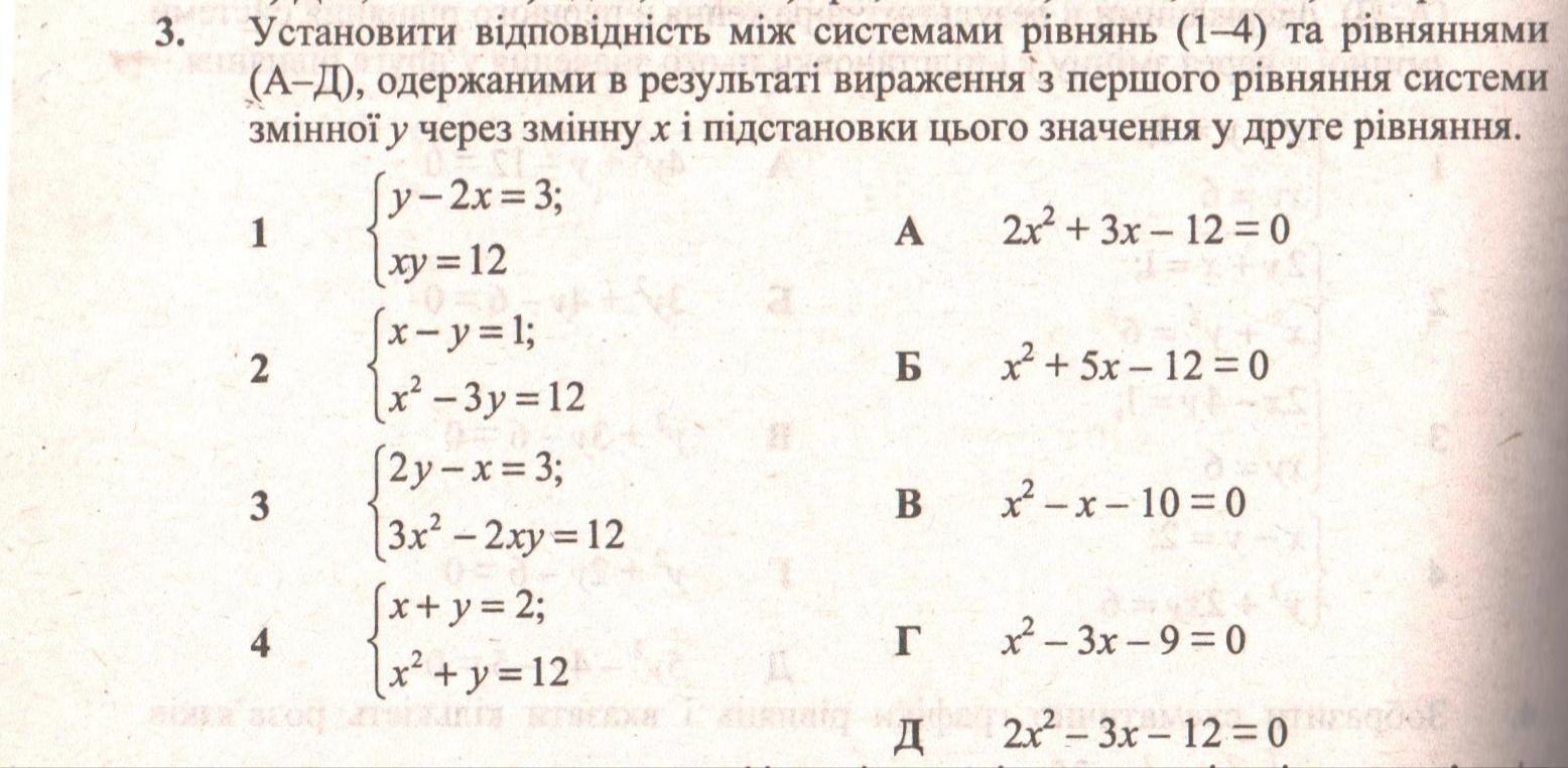 установити відповідність між системами рівнянь (1-4) та рівняннями (а-д), одержаними в результаті вираження з першого рівняння системи змінної у через змінну х і підстановки цього значення у друге рівняння.