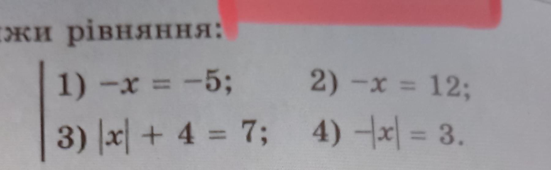 1) -x = -5 2) -x = 12 3)/x/ + 4 = 7 -/x/ = 3